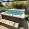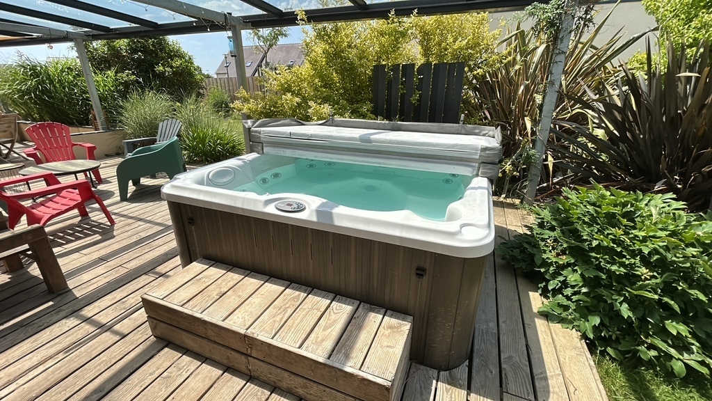 A l'extérieur: terrasse en bois couverte avec un espace détente Jacuzzi, jardin aménagé, cabane pour les enfants. La cour est fermée par un portail.