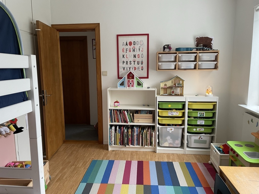A four bedroom apartment in duplex house in Reykjavík. Great location, with Iceland's top swimming pool close by and a 30 minute walk from downtown Reykjavík. There are 4 bedrooms, two kids rooms, one with a kids bunk bed and one of the rooms is in the basement. We can arrange for full size beds in there if needed. We have got most things you would need for kids of different ages, strollers, high chairs etc.