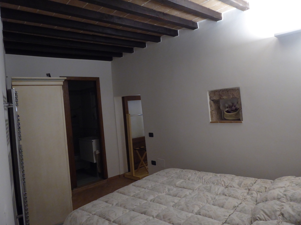 L’appartamento è comodo e confortevole, con soffitto con le volte a botte e mattoni a faccia a vista. In un angolo è addirittura visibile la roccia delle fondamenta di Spello. Utilizzato in antichità come magazzino del vicino convento dei Cappuccini, poi trasformato in cantina ed infine adattato ad abitazione. Uno dei due bagni anticamente era un pozzo ed ha una caratteristica conformazione tronco conica rovesciata. A disposizione c’è anche un focolare circolare sospeso.