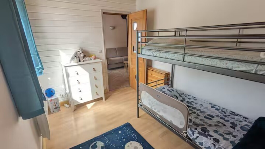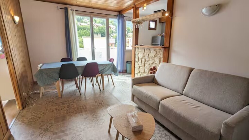 Nice apartment of 45 m2 on the 4th and last floor without elevator of a building comprising a bedroom with a double bed, a bedroom with a folding bed and a bunk bed, a living room (with sofa bed) and an open kitchen. Free parking in the residence.
