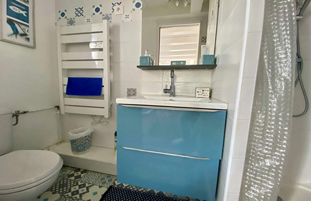 Il y a une cuisine ouverte équipée avec four, micro-ondes, petit réfrigérateur, machine à café Tassimo, grille-pain, plancha, bouilloire. Une pièce de vie avec une table, 4 chaises, un canapé convertible en canapé lit (160cmx190cm), un fauteuil et une télévision. Une salle d'eau avec une douche, sèche serviette, vasque et WC