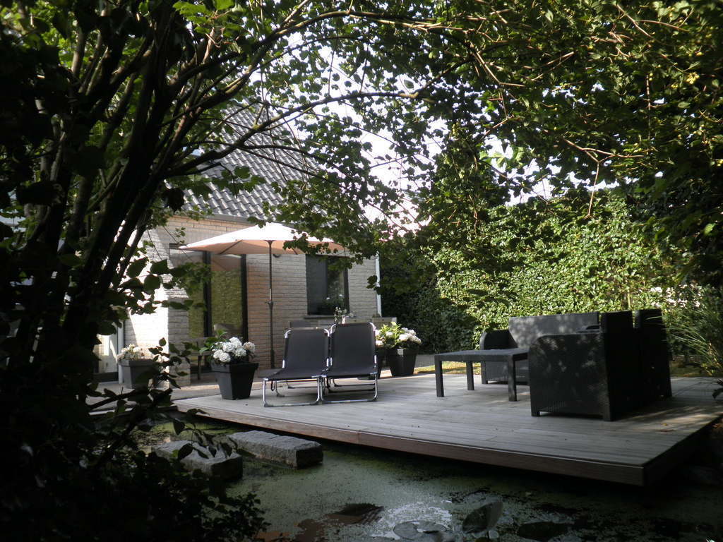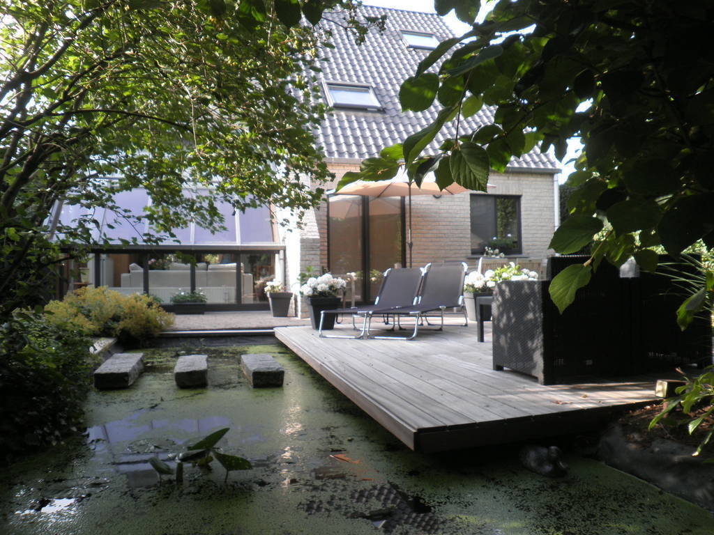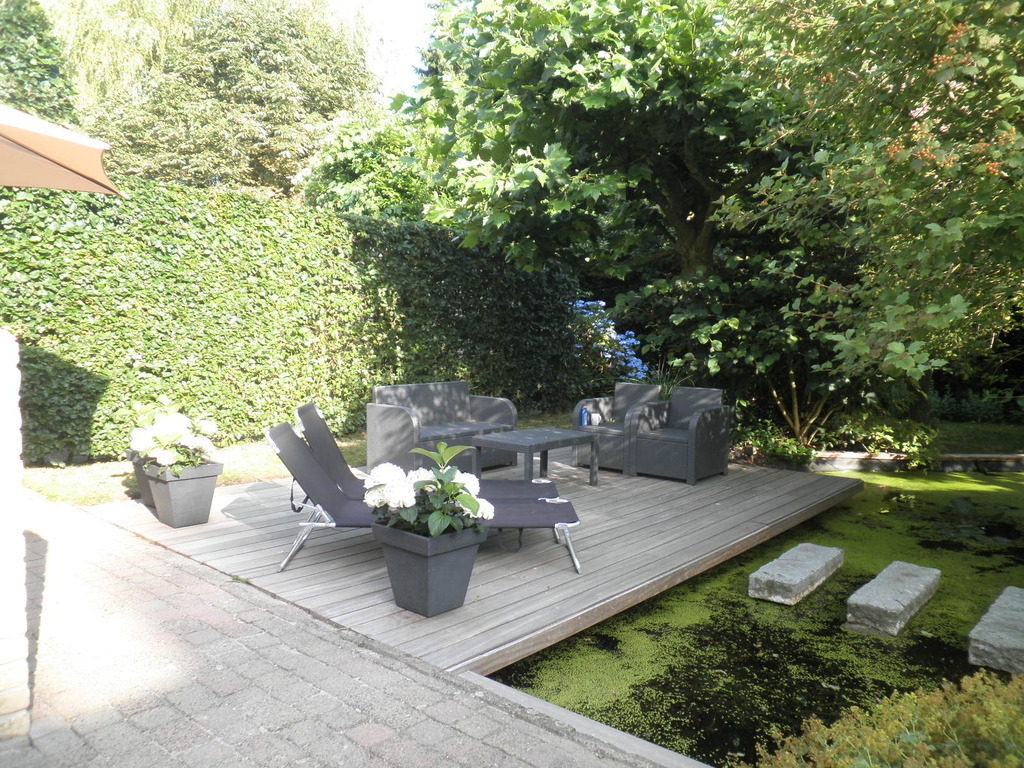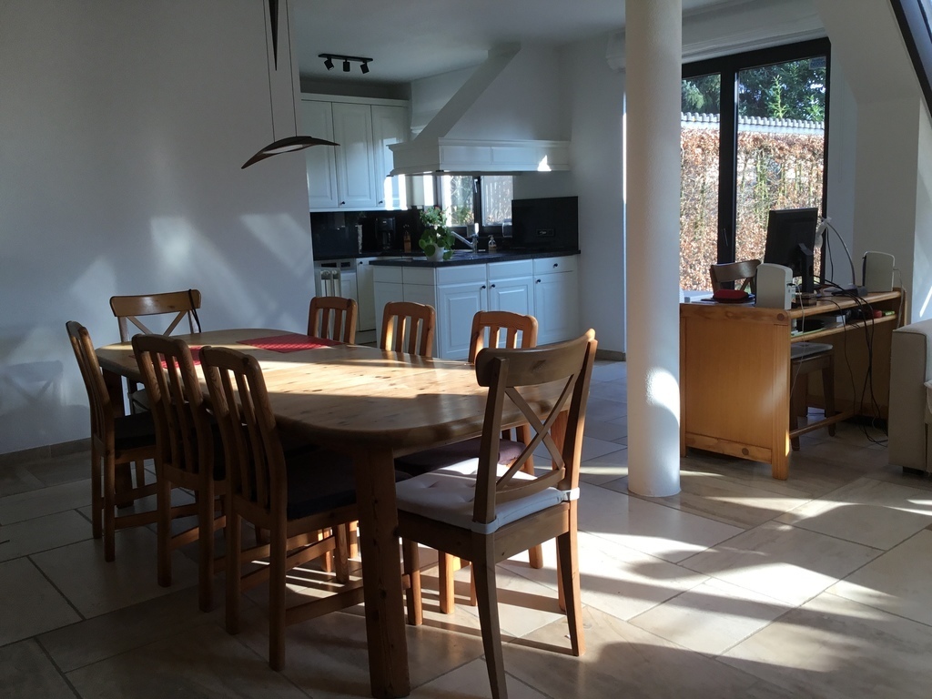 Our house is located in a residential and very quiet district of Hoogstraten. At 50 meters there is a small children-park with swings and other games. We have a garden in front of the house and a garden behind, closed and private. There are several trees that offer shadow in summer and a small pool with terrace and relax-chairs to sunbath if you like and a large teak-wooden table to eat outside when weather is fine. Our back-garden is situated to the South, so it is very nice and sunny. Our house has been built in 1994 and offers all modern comfort. There’s central -heating in all the rooms and the house is well equipped with an anti-theft alarm-system in every place.