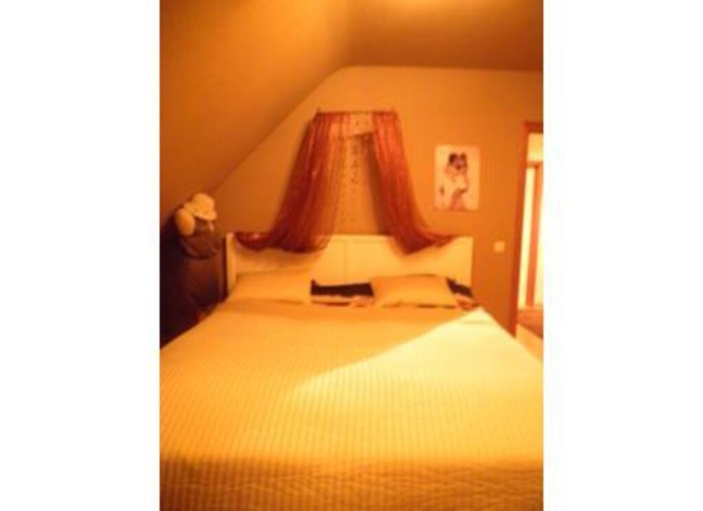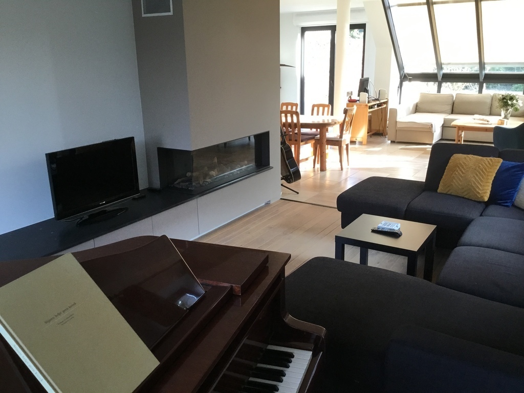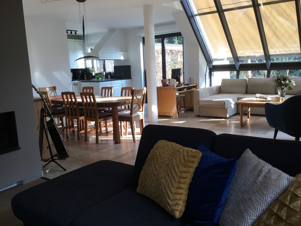 We live in a big modern house with tree floors. On the ground floor there is the living room and lounge with antique pine furniture, a well equipped kitchen, toilets, a large veranda overlooking the garden, a garage for cars and bicycles, shed and room for the washing-machine and drying-machine. Upstairs there are three bedrooms: two bedrooms with one double bed and one bedroom with single bed, bathroom with shower and bath and toilet. On the same floor is also a library and office for personal administration and computer. On the second floor there is a large bedroom and also a large barn and a atelier to draw, sculpt and paint.