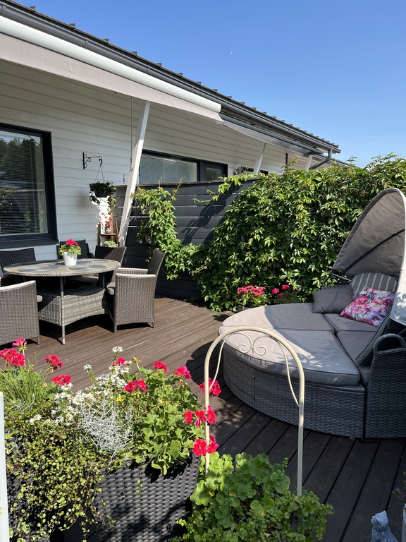 This is a terraced house with a garden and a nice patio. We have two bedrooms, open kitchen and livingroom, a toilet, a bathroom with toilet and sauna. We have one e-bike and one bike which can be used here.